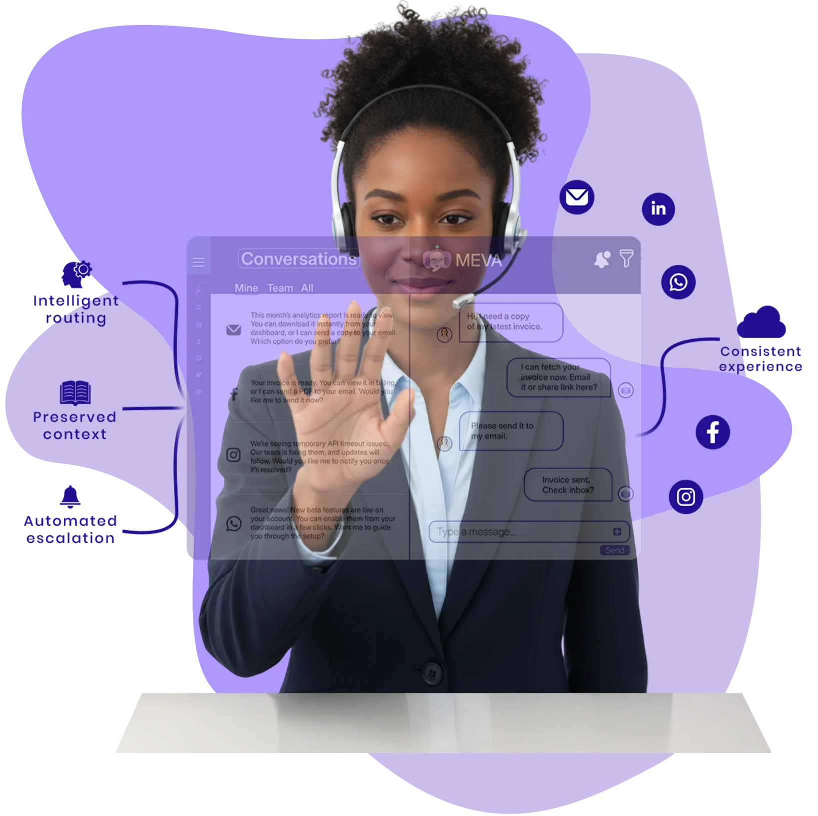 Omnichannel inbox and routing with unified conversation management across 30+ channels. MEVA handles intelligent agent routing, preserves context, and automates escalation workflows so customers get a consistent experience no matter how they reach out.