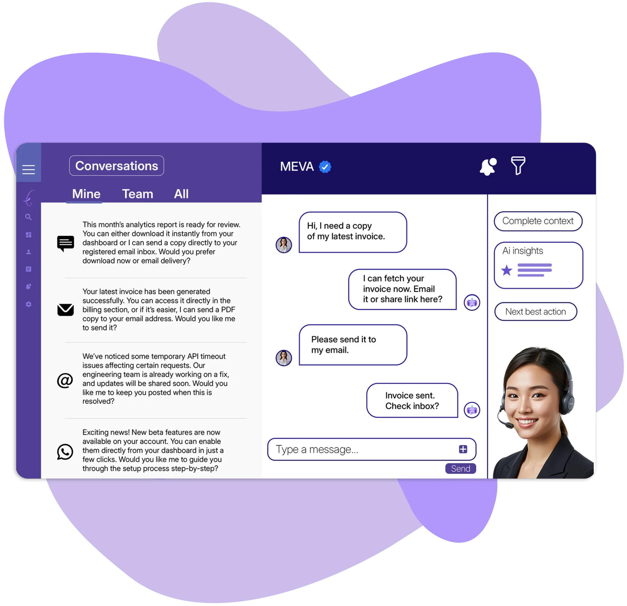 More than a chatbot, MEVA is a deeply embedded AI platform that supports both agents and customers. It delivers real-time coaching, automates replies, retrieves knowledge, and gets smarter with every interaction.